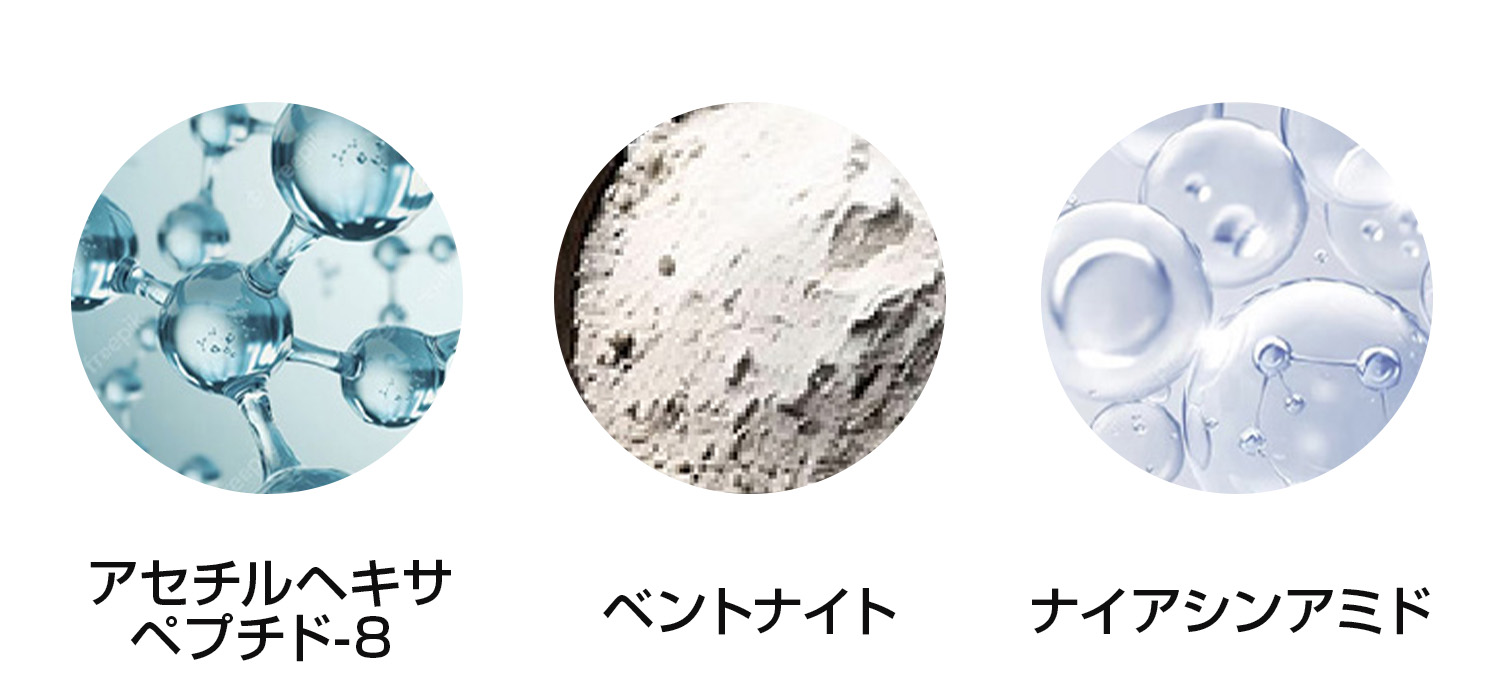 水、グリセリン、ベントナイト、(ジメチコン/ビニルジメチコン)クロスポリマー、シリカ、ペンチレングリコール、アセチルヘキサペプチド-8、パルミチン酸レチノール、セラミドNG、セラミドNP、セラミドAP、加水分解エラスチン、加水分解コラーゲン、水溶性コラーゲン、水溶性コラーゲンクロスポリマー、ヒアルロン酸Na、ナイアシンアミド、プラセンタエキス、ヒメフウロエキス、ニンニク根エキス、ローマカミツレ花エキス、ゴボウ根エキス、アルニカ花エキス、セイヨウキズタ葉/茎エキス、オドリコソウ花/葉/茎エキス、オランダガラシ葉/茎エキス、セイヨウアカマツ球果エキス、ローズマリー葉エキス、セイヨウトチノキ種子エキス、ハマメリス葉エキス、セイヨウオトギリソウ花/葉/茎エキス、ブドウ葉エキス、レモン果実エキス、スギナエキス、クレマティス葉エキス、ヒバマタエキス、セイヨウナツユキソウ花エキス、キュウリ果実エキス、ゼニアオイ花エキス、パリエタリアエキス、セイヨウニワトコ花エキス、トウキンセンカ花エキス、ホップエキス、セージ葉エキス、サボンソウ葉エキス、プルーン分解物、BG、コーン油、フィトステロールズ、水添レシチン、トコフェロール、フェノキシエタノール、エチルパラベン、メチルパラベン、プロピルパラベン、ブチルパラベン、イソブチルパラベン、赤102、黄5