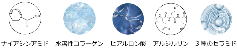 その他にもナイアシンアミド、アルジルリン、ヒアルロン酸Na、水溶性コラーゲン、3種のセラミドの計5種類が配合されています。
