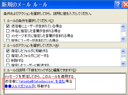 「新規のメール ルール」画面の「3.ルールの説明」の